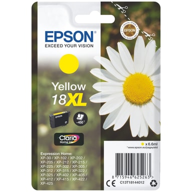 Ersättningspatron Epson Claria Home 18XL bläckpatron innehåller färgämnebaserat bläck i färgen gul, för Epson Expression Home-serien av bläckstråleskrivare och ger upp till 450 sidor av utskrifter.Läs mer om produkten
