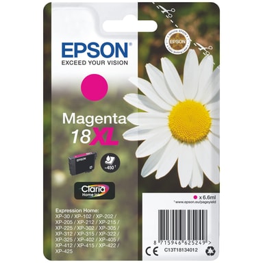Ersättningspatron Epson Claria Home 18XL bläckpatron innehåller färgämnebaserat bläck i färgen magenta, för Epson Expression Home-serien av bläckstråleskrivare och ger upp till 450 sidor av utskrifter.Läs mer om produkten