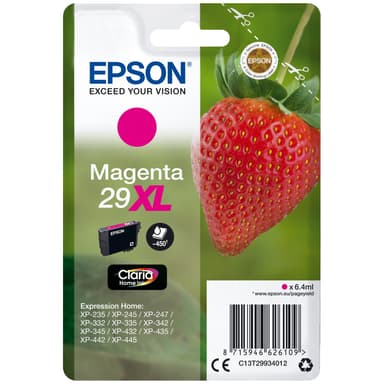 Epson Claria Home 29XL bläckpatron innehåller pigmenterat bläck i magenta för Epson Expression Home-serien med bläckstråleskrivare och ger upp till ca 470 sidor av utskrifter.Läs mer om produkten