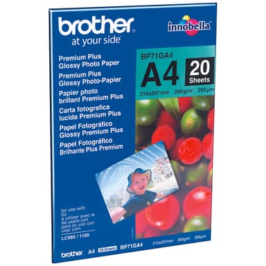 Brother BP71GA4 glossy fotopapper har en jämn och glansig yta, perfekt för at skriva ut dina favoritbilder. Utskriften torkar snabbt, utan smetning. Innehåller 20 st A4 fotopapper.Läs mer om produkten