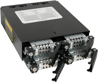 ICY DOCK internt kabinett för 4x2,5" SSD/SATA-hårddiskar, SAS/SATA 6Gb/s, tar upp 1x5,25"-plats, låsbar, metall, svartSmidigt kabinett som rymmer plats för fyra stycken 2,5" SSD/SATA hårddiskar i en enda 5,25"-plats.Läs mer om produkten