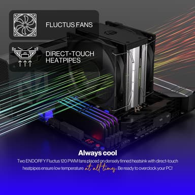 Endorfy Fera 5 dubbelfläktad CPU-luftkylare är utformad för både nya och äldre processorer. Den är utrustad med dubbla 120 mm Fluctus-fläktar som båda går i 1800 rpm för kraftfullt och tyst luftflöde och fungerar med både Intel- och AMD-processorer.Läs mer om produkten