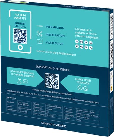 Säkerställ en tyst och effektiv kylning för din Arctic P14 Slim 140 mm PWM PST-fläkt. Den fokuserade luftströmmen säkerställer hög statiskt flöde med låga ljudnivåer.Läs mer om produkten