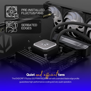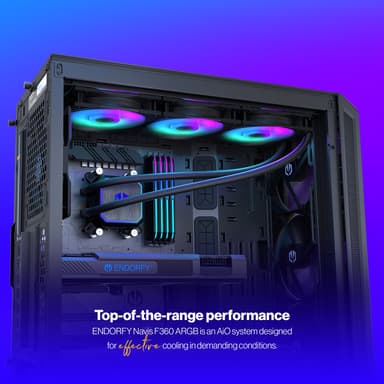 Endorfy Navis F360 ARGB CPU-vätskekylare med 3 ljusstarka Fluctus 120 PWM ARGB-fläktar. Varje fläkt roterar upp till 1800 varv/min för att hålla din dator sval. Den fungerar med många populära CPU-socklar för enkel installation.Läs mer om produkten