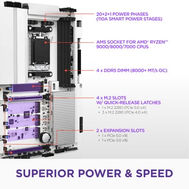 NZXT N9 X870E moderkort erbjuder överlägsen anslutning med Wi-Fi 7, Bluetooth 5.4, stöd för DDR5-minne, har PCIe 5.0 och AMD X-chipset för utmärkt prestanda och expansionsmöjligheter.Läs mer om produkten