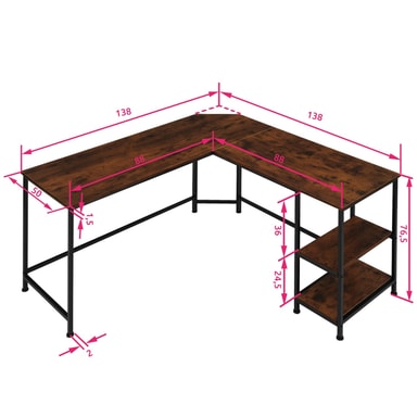 Det rustika Hamilton-skrivbordet från tectake ger en luftig, lätt industriell stil till ditt hemmakontor. Skrivbordens varma träytor skapar tillsammans med det svala stålet i den svarta ramen en tilltalande atmosfär, perfekt att använda för att skapa en lugn arbetsatmosfär. Den avfasade kanten i hörnområdet skapar ett urtag som lämpar sig väl för kabelplacering för en bärbar dator, datorer, bildskärmar, skrivare, nätverksmodem och andra tekniska apparater. Det praktiska bordsstället i L-formen gör att det är optimalt att använda som hörnskrivbord. Det grunda djupet och två hyllplan på sidan säkerställer snabb åtkomst till allt du kan tänkas behöva och gott om plats för att lagra dokument på ett utrymmesbesparande sätt. Använd ditt Hamilton skrivbord för få mer kontorsutrymme. Finns i industriellt mörkt, industriellt ljus.