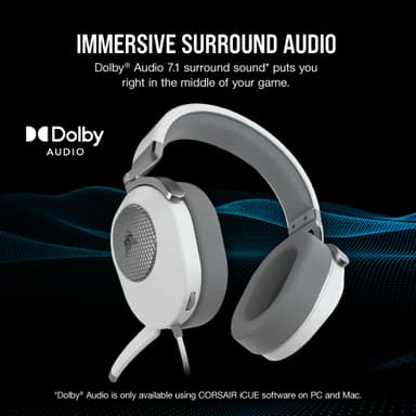 Corsair HS65 Surround gamingheadset är utrustat med 50 mm neodym-drivelement fö kristallklar ljudåtergivning. Dessa hörlurar är designade för spel och har mjuka öronkåpor i minnesskum och ett justerbart pannband för långvarig komfort.Läs mer om produkten