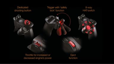 Designed for use with combat simulations and all other flight simulations, the Raptor Mach 2 provides a great sense of realism with function and button shift modes to achieve 29 programmable actions. The ergonomic design not only looks good but also feels intuitive in-play and reduces the fatigue associated with long flying periods. • Electromagnetic technology for smooth precise movement and reliability • 2 functional modes and button shifts collectively achieve 29 programmable actions • Powerful 32bit ARM chip gives increased sensitivity and functionality • 4 axis X,Y,Z and RX for full pitch, roll and yaw movement as well as throttle control • Sensitivity of 4096 points • 8 -way HAT switch with POV function provides increased control over trim, weapon systems and menus • Eject function button • Trigger with safety lock function • Dedicated shooting button