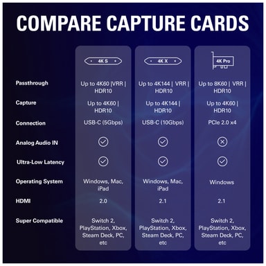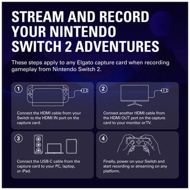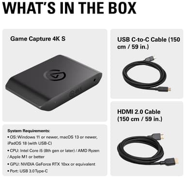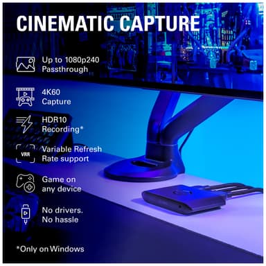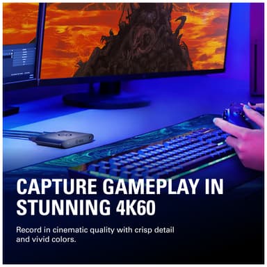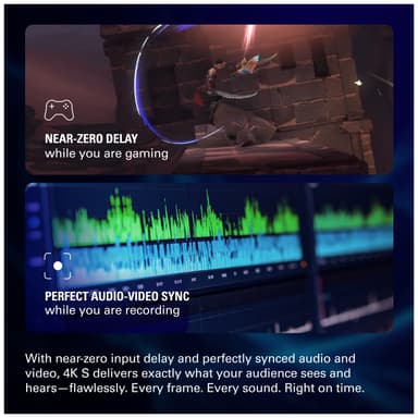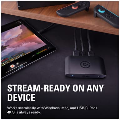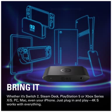 Elgato Game Capture 4K S erbjuder 4K60, 1440p120 eller 1080p240 inspelning med minimal fördröjning, HDR10, VRR-genomströmning och plug-and-play för PS5, Xbox eller Switch 2 på Windows, macOS och iPadOS.Läs mer om produkten