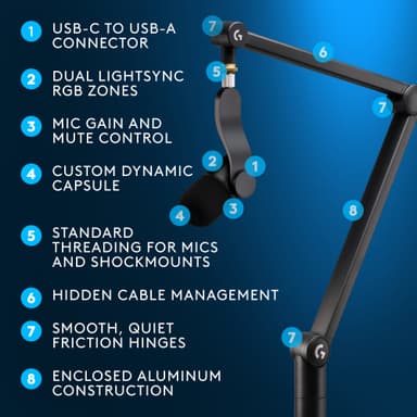 Strömma eller spela in videor med exceptionell ljudkvalitet tack vare Logitech G YetiCaster GX mikrofon smed arm som har dynamisk kapseldesign, avancerad Blue VO!CE-programvara med olika effekter och filter samt stöd för Lightsync-teknik.Läs mer om produkten