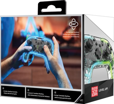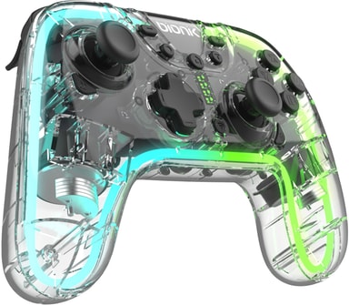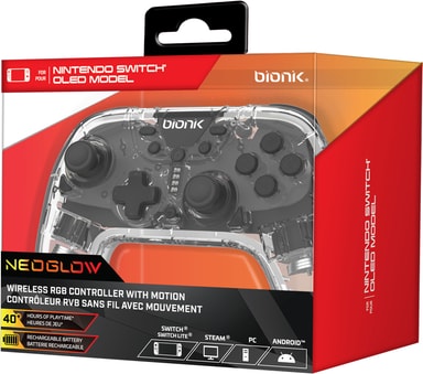 Bionik Neoglow Nintendo Switch trådlös gamepad har en transparent design med RGB-belysning, upp till 40 timmars speltid och ett högkapacitetsbatteri på 900 mAh. Njut av två programmerbara knappar, rörelsekontroll och tre nivåer av mullrande intensitet.Läs mer om produkten