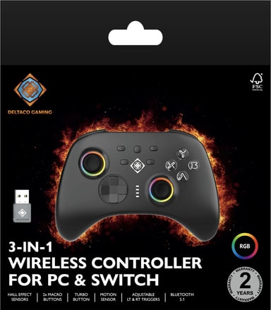 Deltacos trådlösa spelkontroll för PC & Switch har Bluetooth 5.1, 2.4G trådlöst, USB-C, ergonomisk design, halleffektknappar, justerbara triggers och 17 timmars batteritid för en mångsidig spelupplevelse.Läs mer om produkten