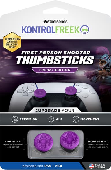 Kontrol Freek FPS Frenzy PS5 tumgrepp är designade för att förbättra sikte och rörelse i FPS-spel. De har ett set med dubbla höjder där ett medelhögt stick ger bättre kontroll av vänster stick och ett högt stick ger ökad precision för höger spak.Läs mer om produkten