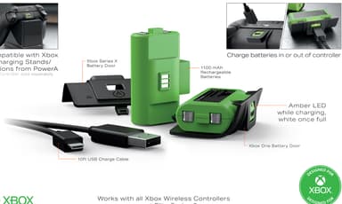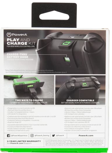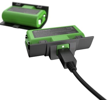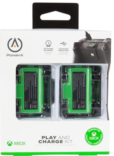PowerA Play and Charge kit Xbox innehåller 2 uppladdningsbara 1100 mAh-batterier med 4 batteriluckor så att de är kompatibla med både Xbox One och Xbox Series X/S. Batteriet ger dig upp till 20 timmars spelande per laddning.Läs mer om produkten