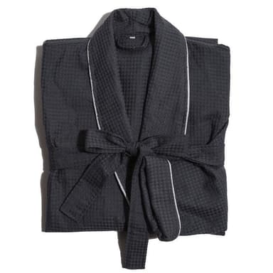 En lyxigt designad, våfflad, sparock. Perfekt att svepa om sig efter ett dopp i bubbelpoolen. Tar lite plats och är lätt att hantera. Den torkar snabbt. Sparocken har en snygg och stilren piping på krage, fickorna och ärmen.