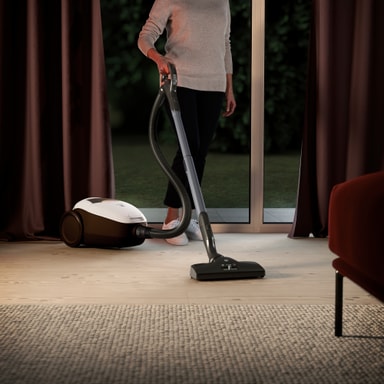 Dammsugaren är enkel och smidig att lyfta och bära med det specialutformade bärhandtaget. Det har placerats i mitten så att vikten fördelas jämnt – designad för balanserade lyft.