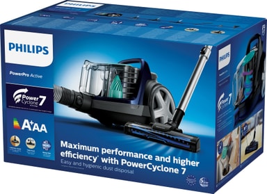 Supereffektiva Philips PowerPro Active dammsugare FC9556/09 levererar felfri rengöring på nolltid. Dammsugaren är utrustad med en praktisk dammbehållare med en kapacitet på 1,5 liter, som är designad för extra hygienisk tömning.Läs mer om produkten