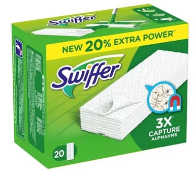Swiffers refiller kan användas med golvmoppen för att fånga upp och låsa in smuts, damm och hår från vilken golvyta som helst i hemmet, tre gånger bättre än en traditionell sopborste. Den kan också användas som ett komplement till din dammsugare eftersom den fångar upp de små dammkorn som dammsugaren inte tar, eller som ett städverktyg att använda mellan dammsugningar för att slippa storstädning allt för ofta.