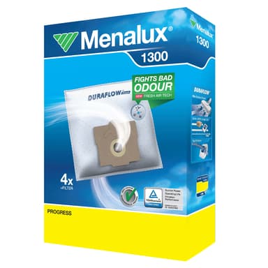 Fyra Menalux 1300 dammsugarpåsar i syntet som passar dammsugare från Progress, Tornado och Volta.Läs mer om produkten