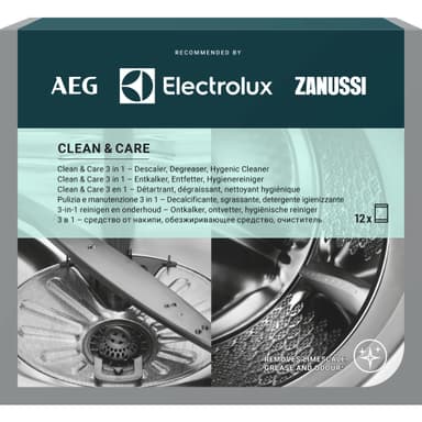 Clean and Care - 3 in 1 Rengöringsmedel som avkalkar, avfettar och rengör diskmaskiner och tvättmaskiner. Avlägsnar kalk, fett och dålig lukt för en fräsch och ren maskin. Innehåller 12 påsar x 50 g.Läs mer om produkten