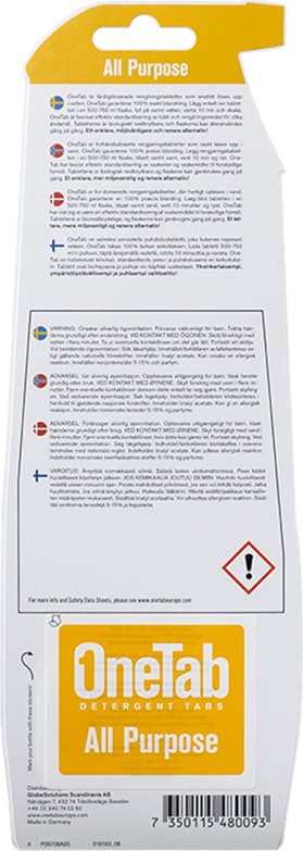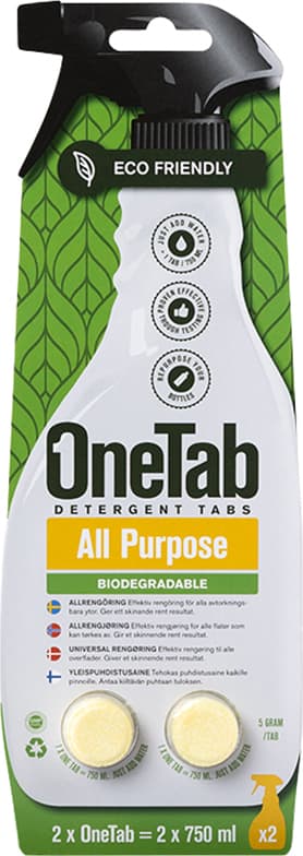 OneTab rengöringstablett ONETAB49 är den miljövänliga lösningen för rengöring, eftersom den enkelt kan lösas i 750 ml varmt vatten, vilket minskar onödig plastförpackning och vattenanvändning. Detta paket har 2 universalrengöringstabletter.Läs mer om produkten