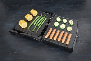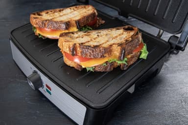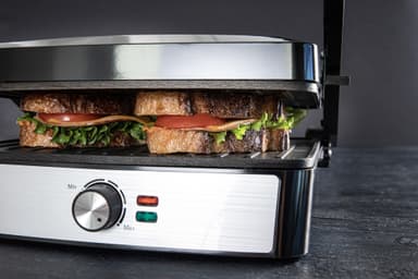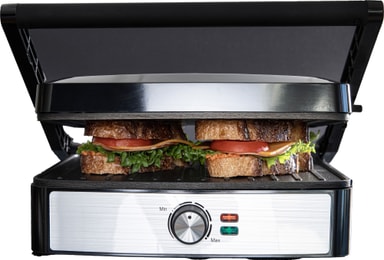 Njut av grillade grönsaker, rostat bröd och biffar med Gastronoma panini grill 18240001. Denna 2200-watts kontaktgrill fungerar även som bordsgrill och har en non-stick beläggning och justerbar termostat för enkel användning.Läs mer om produkten