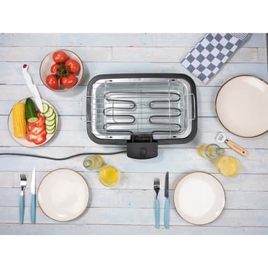 En lättplacerad elgrill för både inomhusbruk eller på balkonger / uteplatser, där kol och gasgrillar inte är tillåtna. Med stor grillyta på ca. 43x35x60 cm.