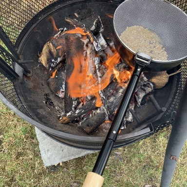 Denna praktiska popcorngryta är perfekt för bålpannor och öppen eld. Med sitt justerbara skaft är den lätt att hantera och smidig att ta med på utflykter. Träskaftet, i traditionell nordisk stil, håller sig svalt för säker användning.