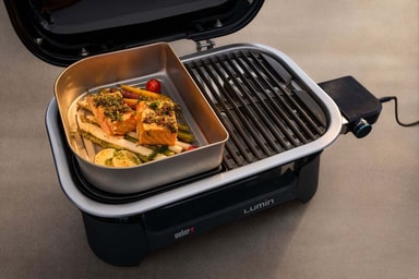 Weber mångsidigt grillkit 6614 förvandlar din Lumin elgrill till en ång- och rökgrill. Använd behållaren för att tillföra vatten eller träflis för att ånga eller röka kött, grönsaker och annat. Två värmebrickor för servering medföljer.Läs mer om produkten
