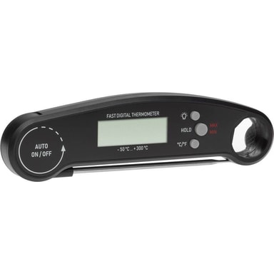 • Hopfällbar termometer i fickformat · bakgrundsbelysning · Snabb och exakt mätning · Med flasköppnare och magnethållare