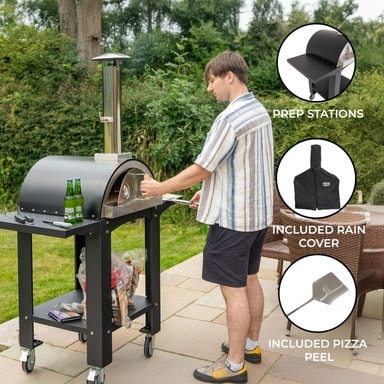 Tillverkad av högkvalitativt, tungt stål är denna ugn designad för att tåla frekvent användning och ge långvarig prestanda. Trähandtaget är värmebeständigt och säkerställer din säkerhet vid hantering av ugnen. Med robusta hjul kan du enkelt flytta denna pizzaugn runt i din trädgård eller på din uteplats för att hitta den idealiska matlagningsplatsen. Det medföljande regnskyddet skyddar din ugn från väder och vind och förlänger dess livslängd.
