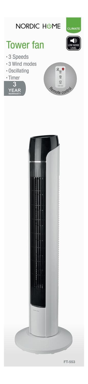 FT-553 från Nordic Home är en elegant & tyst tornfläkt med timerfunktion, 3-hastighetsinställningar, 3-vindlägen samt ett oscillerande läge för en jämn och behaglig distribution av luft i hela rummet.