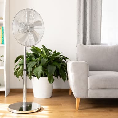 3 hastighetsnivåerFläktbladets diameter på 40 cmAutomatisk horisontell 90 ° -oscillation med avstängningsalternativJusterbar lutningsvinkelJusterbar höjd från 103 till 126 cmFrämre och bakre skyddande metallgrillStabil basLäs mer om produkten