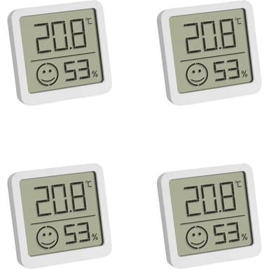 TFA Dostmann 4er Set Digitales Thermo-Hygrometer mit Komfortzone Termo-/Hygrometer VitKomfortzon med smileyMed självhäftande folie och stativDigital termo-/hygrometer med komfortzon 30.5053.02Kontroll av inomhustemperatur och luftfuktighetKomfortzonLäs mer om produkten