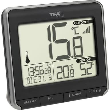 TFA Dostmann PRIO Trådlös digital termometer Svart, VitTrådlös överföring av utomhustemperatur genom sändaren (max. 100 m) Visar inomhustemperatur och luftfuktighet Max./min.-funktion Tendenspilar och larm för utomhustemperatur Radiostyrd klocka medLäs mer om produkten
