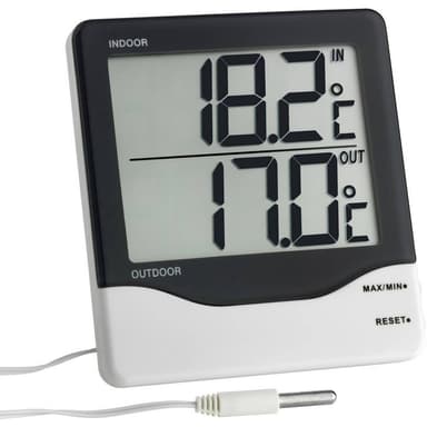 TFA Dostmann Termometer Svart-vitVisar inomhus- och utomhustemperaturer · Utomhustemperatur med kabel · Även för övervakning av frysenhet/akvarium · Högsta och lägsta värden · Extra stor display · ISO kalibreringscertifikat - testpunkter:Läs mer om produkten