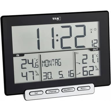 TFA Dostmann Trinity Trådlös termo-/hygrometer SvartTendenspilar Max/ Min-funktion. Stora radiostyrd klocka med datumvisning och utskriven veckodag (6 språk) Strömförsörjning bas: 2 x 1,5 V AA Strömförsörjning sensor: 2 x 1,5 V AATrådlös överföringLäs mer om produkten