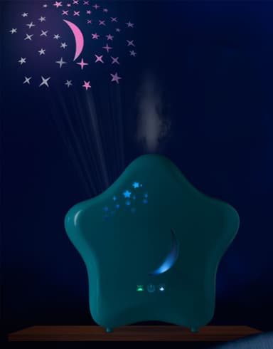 Moony luftfuktare för ditt barns sovrum. Luftfuktaren lugnar honom eller henne med nattljusfunktionen och fängslar barnet genom att projicera månen och de färgade stjärnorna på taket.