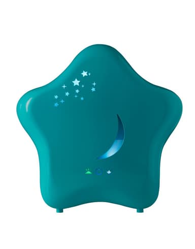 Så, genom den fuktiga luften, omvandlar den magiska Moony stjärnan barnets rum till en frisk och lugnande miljö vid sängen. Den sprutar också ut eteriska oljor. Den har även ett lugnande nattljus med sin milda vita ljus och fängslar barnet med sin projicering av månen och färgade stjärnor på taket. Dessa funktioner kan också användas separat när du behöver dem.