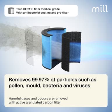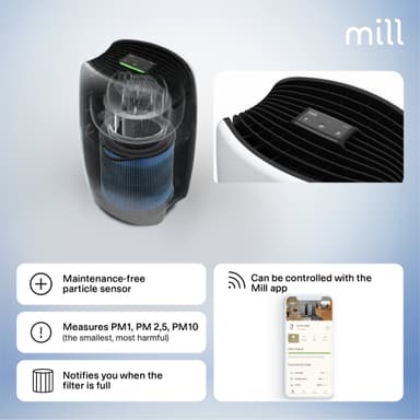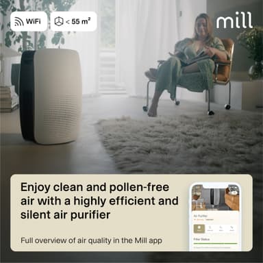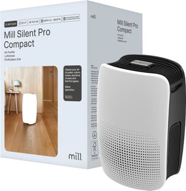 Mill Silent Pro Compact luftrenare APSILENTCO är lämplig för små rum upp till 55 m2. Dess HEPA 13 och aktivt kolfilter fångar upp damm, allergener, pollen och lukter, vilket säkerställer frisk och ren luft. Anslut till Mill-appen för enkel styrning.Läs mer om produkten