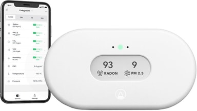 Vi tillbringar runt 90% av vår tid inomhus och View Plus hjälper dig hålla koll på luftens kvalitet. Omfattande luftkvalitetsmätare med sju sensorer som mäter radongas, luftburna partiklar (PM2,5), koldioxid (CO2), lättflyktiga organiska föreningar (VOC), luftfuktighet, temperatur och lufttryck. Perfekt för kök och vardagsrum där familjen samlas.