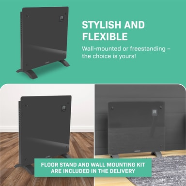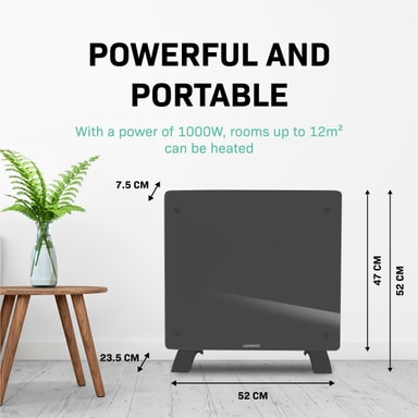 Effekten på 1000W ger tillräckligt med kraft för att värma utrymmen på upp till 12 m2 . De praktiska måtten (52 x 47 cm) gör den här enheten lätt att flytta så du kan värma upp vilket önskat rum som helst på nolltid. Det är perfekt när du arbetar hemifrån och inte vill ha centralvärme igång hela dagen. Vill du hellre montera elementet på väggen? Inga problem. Vi skickar med ett golvstativ samt en monteringssats. Vi lämnar valet upp till dig!