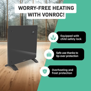 Naturligtvis har vi ägnat stor uppmärksamhet åt säkerheten. Därför har vi utrustat elementet med ett barnsäkert lås för att undvika oavsiktliga justeringar av inställningarna. Dessutom är den är modellen försedd med fall och överhettningsskydd. Detta innebär att värmaren automatiskt stängs av om den skulle välta eller om den skulle bli överhettad.