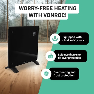 Naturligtvis har vi ägnat stor uppmärksamhet åt säkerheten. Därför har vi utrustat elementet med ett barnsäkert lås för att undvika oavsiktliga justeringar av inställningarna. Dessutom är den är modellen försedd med fall och överhettningsskydd. Detta innebär att värmaren automatiskt stängs av om den skulle välta eller om den skulle bli överhettad.