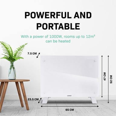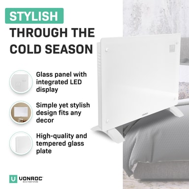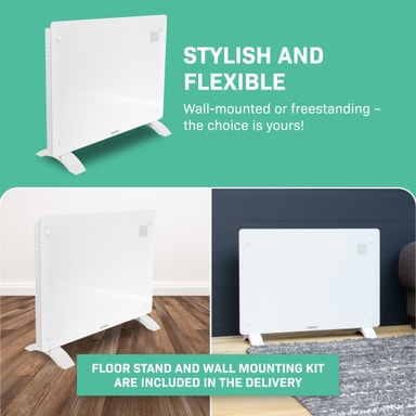 Effekten på 1500W ger tillräckligt med kraft för att värma utrymmen på upp till 18 m2 . De praktiska måtten (65 x 47 cm) gör den här enheten lätt att flytta så du kan värma upp vilket önskat rum som helst på nolltid. Det är perfekt när du arbetar hemifrån och inte vill ha centralvärme igång hela dagen. Vill du hellre montera elementet på väggen? Inga problem. Vi skickar med ett golvstativ samt en monteringssats. Vi lämnar valet upp till dig!