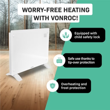 Naturligtvis har vi ägnat stor uppmärksamhet åt säkerheten. Därför har vi utrustat elementet med ett barnsäkert lås för att undvika oavsiktliga justeringar av inställningarna. Dessutom är den är modellen försedd med fall och överhettningsskydd. Detta innebär att värmaren automatiskt stängs av om den skulle välta eller om den skulle bli överhettad.