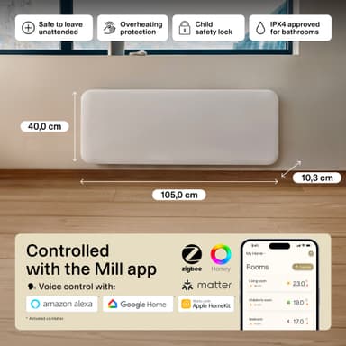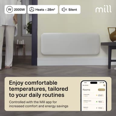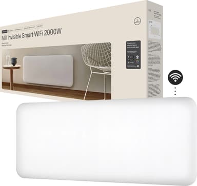 Mill Invisible Wi-Fi Gen4 panelvärmare PA2000WIFI4 är kompakt och värmer upp rum på upp till 28 m². Denna värmare har en elektronisk termostat och är säker att använda i våtutrymmen. För förbättrad kontroll kan den anslutas till Mill Wi-Fi-appen.Läs mer om produkten