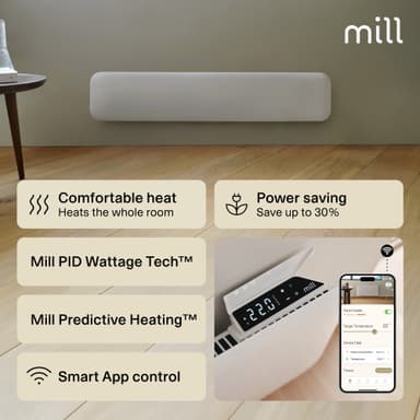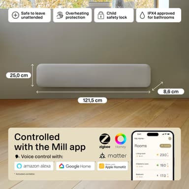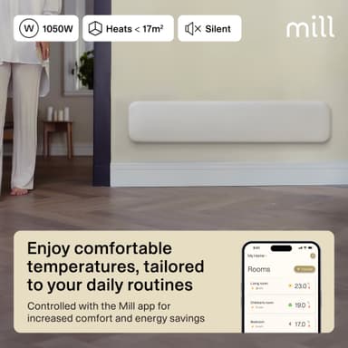 Mill Invisible WiFi Gen4 PA1050LWIFI4 är en kompakt panelvärmare för upp till 17 m², med elektronisk termostat och säker för våtutrymmen. Kan styras via Mill Wi-Fi-appen.Läs mer om produkten