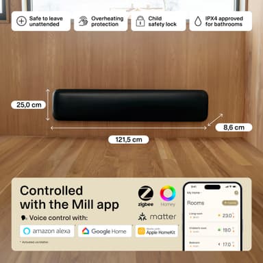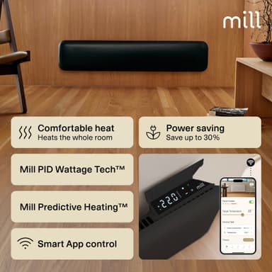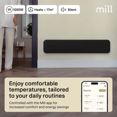 Mill Invisible WiFi Gen4 panelvärmare PA1050LWIFI4BLACK är kompakt och värmer upp rum på upp till 17 m². Denna bärbara värmare har en elektronisk termostat och är säker att använda i våtutrymmen.Läs mer om produkten