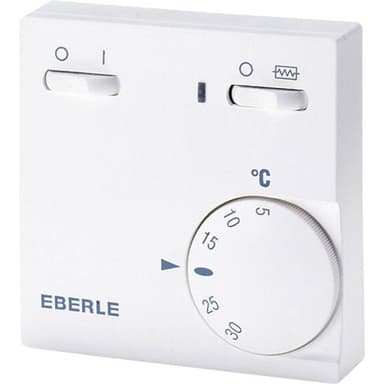 Eberle RTR-E 6181 Rumstermostat Utanpåliggande 5 till 30 °CBimetallteknik med termisk återföring · 5 - 30 °C, AC 230V, 1 OE, 10 A. · På/av och tilläggsvärme inkl. lampaLäs mer om produkten